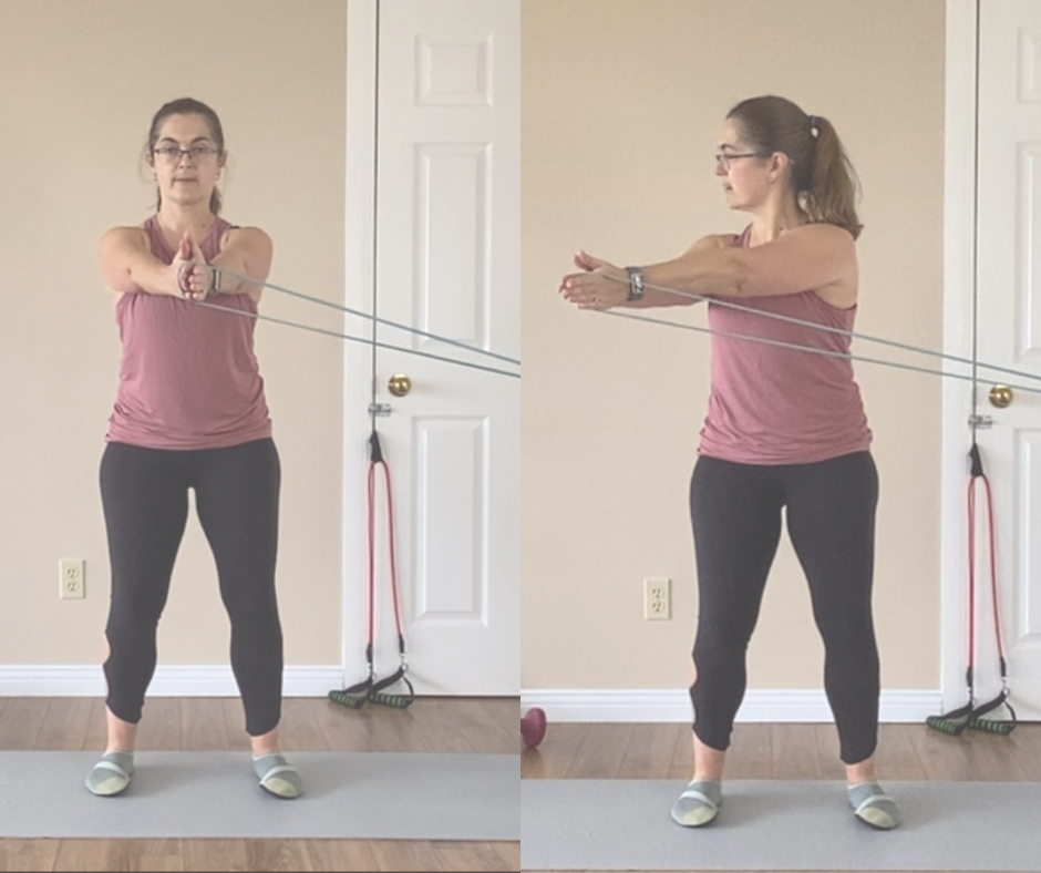 - Wall reach: Standing, reach your arms forward and slightly down while keeping your ribs soft. Exhale gently to feel your ribs back and stacked over your pelvis.